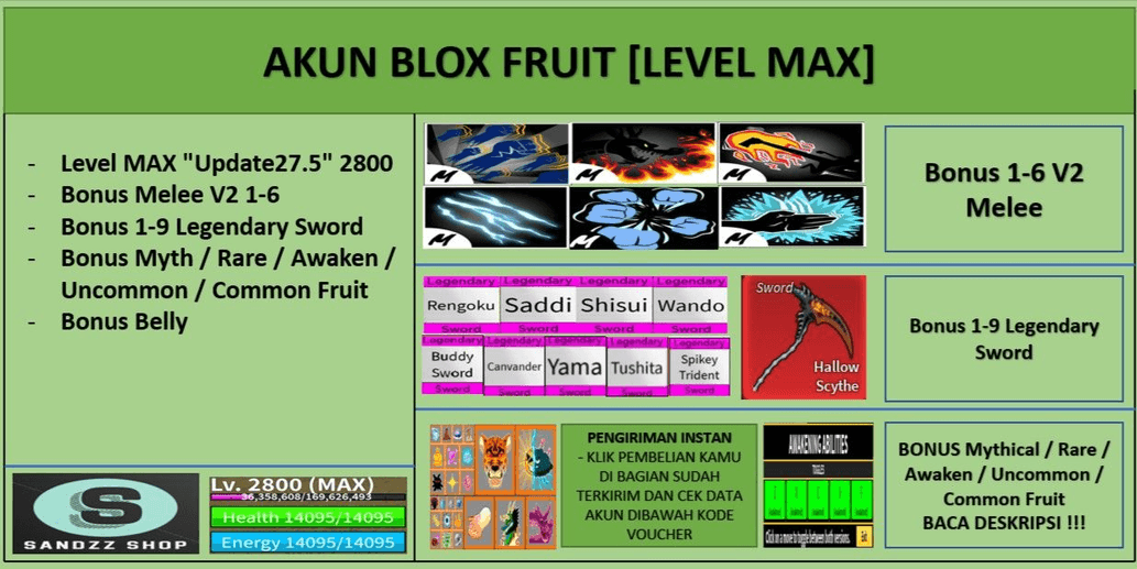 (Read the description below !!!) (Automatic Account Delivery, Check Order History for account data information) Account Specs: - MAX Level "Update 27.5" 2800 - Bonus 1-6 V2 Melee - Bonus 1-9 Legendary Sword - Bonus Awaken / Rare / Myth / Uncommon / Common Fruit - Bonus Hallow Scythe (If Lucky) - Bonus Accessories in Inventory - Bonus Belly - Account guaranteed safe, please check the reviews NOTICE !!! - As sales now use Instant Delivery, after making payment, please directly check your Purchase History. The account data has been automatically sent there. - If anything is unclear, please send me a message - Do not delete / Uninstall the Roblox Application without logging out first