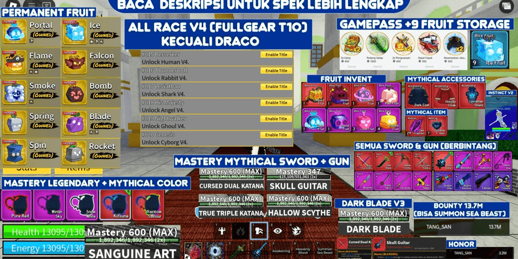 Akun Blox Fruit Semua Race V4 Full Gear T10 (Awakening) Kecuali Draco, Perm Portal Dll, Pass All -Notif(SANGUINE+DB+CDK+HS+TTK+SG) Full Spek Deskripsi