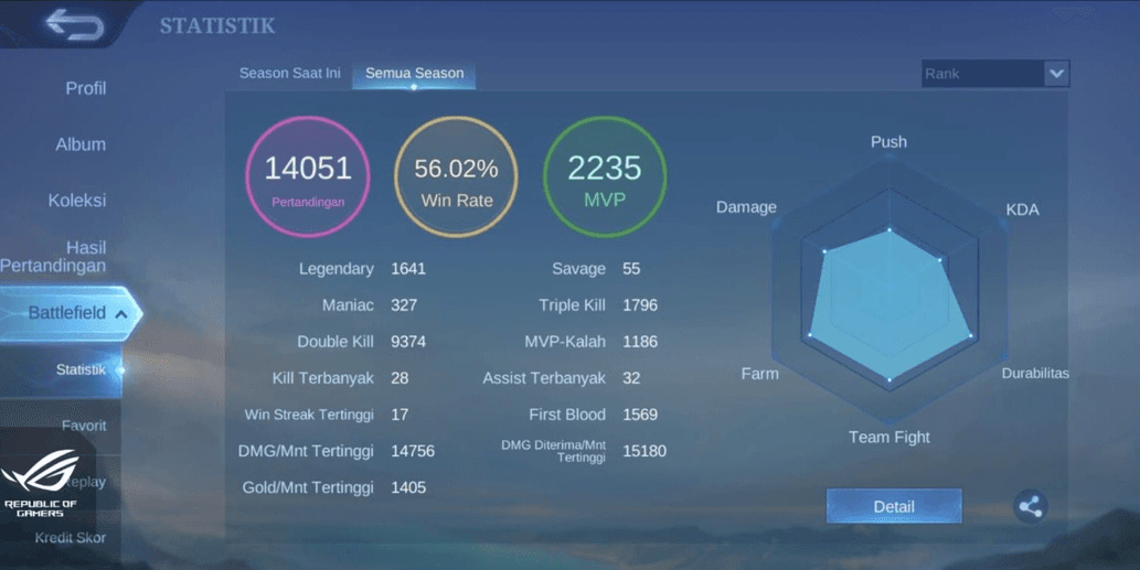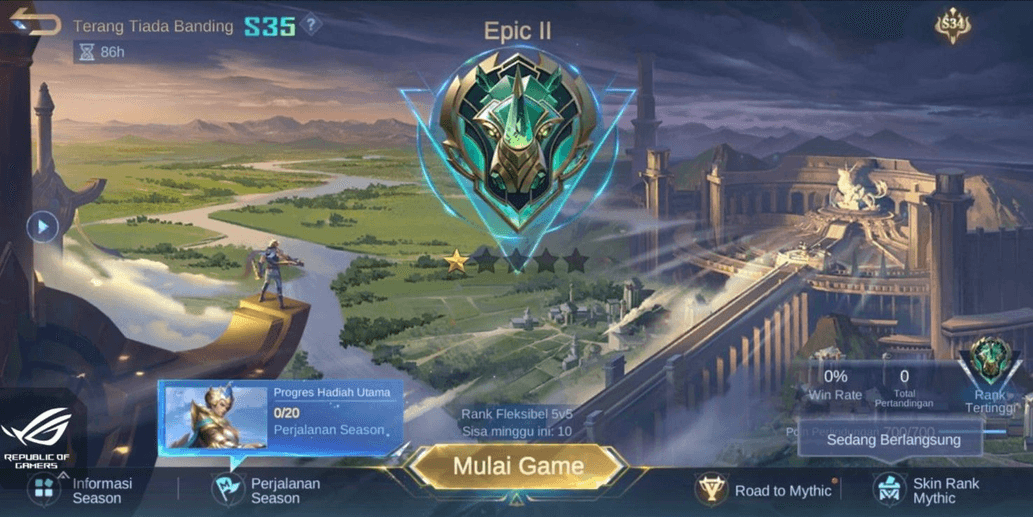 Platform (Android / iOS): Android Rank: Epic 2 Win Rate: 56% Number of Heroes Owned: 127 Hero List: Complete Number of Skins Owned: Common: Many Elite: Many Starlight: Many Special Skins: Franco, Kagura, Chou, Hanzo, Natan, Kadita, Helcurt, Belerick, Jawhead, Chang'e, Kimmy, Guinevere, Valir, Clint, Badang, Thamus, Johnson, Terizla, Silvanna, Lolita, Martis, Kimmy, Aulus, Harley, Odette, Lapu-Lapu, Sun, Baxia Summer Skins: Faramis, Nana, Clint, Kagura, Akai S.A.B.E.R. Skins: Freya, Saber Venom Skins: Angela, Grock Valentine Skins: Alucard, Claude, Gusion Blazing Skins: Esmeralda, Layla, Franco, Aldous, Claude Lightborn Skins: Fanny, Harith, Alucard Dragon Skins: Valir, Masha Ling, Kimmy, Lancelot Stun Skins: Brody, Chou, Selena Epic Skins: Lunox, Selena, Grock, Irithel, Freya, Nana, Uranus, Alice Lucky Box Skins: Claude, Saber, Karrie, Ruby, Uranus, Alpha, Selena Zodiac Skins: Lancelot, Selena Event Skins: Lunar Change, Sparkle Fredrin, Valir Saint Seiya, M2 Clint, Moskov Infernal Wyrmlord, Esmeralda AS, Faramis Myth 2023, Kagura STAR, Hayabusa STAR, Kagura Exorcist, Gusion 11.11 Collector Skins: Pharsa, Granger, Natalia Legend: Gusion