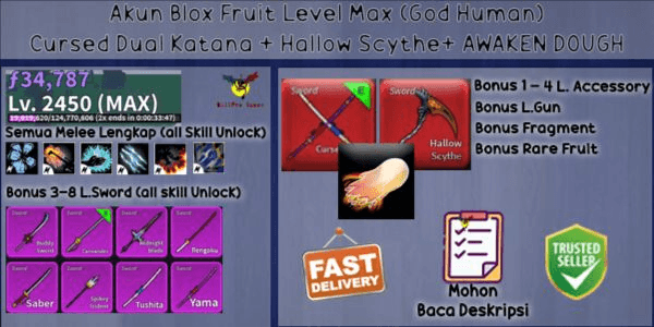 GodHuman Max Level Account (Cursed Dual Katana + Hallow Scythe) AWAKEN DOUGH