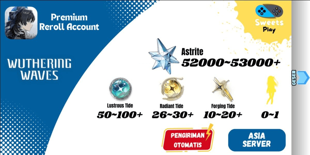 **Product Details** • A Wuthering Waves reroll account on the ASIA server with resources as shown in the product thumbnail. • The account has completed the tutorial, and the Convene (Gacha) feature is unlocked. • The account can be used on iOS, Android, PC & PS5. • Novice Convene & Novice Selector Banner are still available. • More Radiant / Lustrous / Forging Tides can be purchased from the shop using Afterglow Coral and Oscillate Coral. • If you have any questions, feel free to message via Itemku. **Delivery** • Once payment is confirmed, account credentials will be sent instantly through the product order details on Itemku. • You will receive Kuro Games account credentials and the linked email. • Account data is delivered in the format: Email, Game Password / Email Password. **Account Login Guide** You can view the login guide in the product photo slides. **Security Guarantee** You will receive full access to the game account and email.