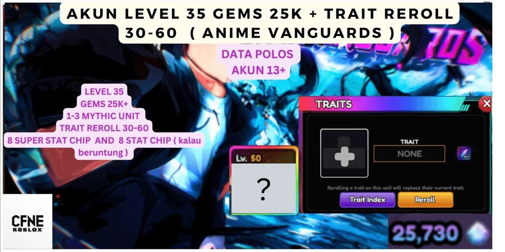 ACCOUNT LEVEL 35 - GEMS 25K - TRAIT REROLL 30-60 (ANIME VANGUARDS)