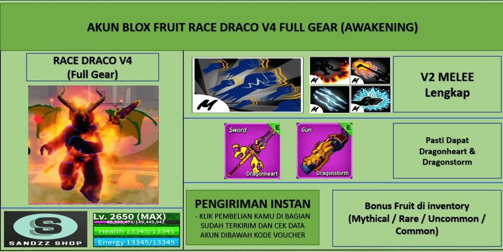 (Read the description below!!!) (Automatic Account Delivery, Check Order History for account data info) Account Specs: - DRACO V4 FULL GEAR (AWAKENING) - MAX Level "Update26" 2650 - Complete Melee V2 [Godhuman, Dragon Talon, Electric Claw, Death Step, Sharkman Karate] - Complete Melee V1 [Superhuman, Dragon Breath, Dark Step, Electro, Fishman Karate] - Bonus 1-8 Legendary Sword - Guaranteed Dragonheart - Guaranteed Dragonstorm - Bonus Fruit in inventory (Mythical / Rare / Uncommon / Common) - Bonus Belly - Account guaranteed safe, please check the reviews NOTICE !!! - Since sales now use Instant Delivery, after making payment, please immediately check your Purchase History. The account data has been automatically sent there. - If anything is unclear, please send me a message - Do not delete / Uninstall the Roblox Application without logging out first