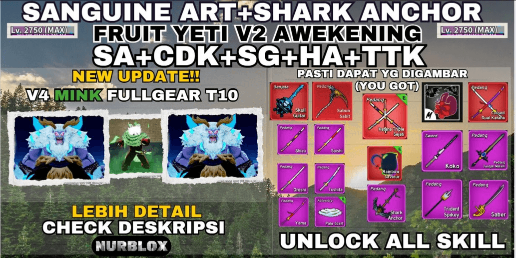 Akun Blox Fruit V4 MINK FULLGEART10 (Awakening) - FRUIT YETI+TTK+SANGUINE ART+SHARKANCHOR+CDK+HS+SG - {LVLMAX} UNLOCK ALL SKILL