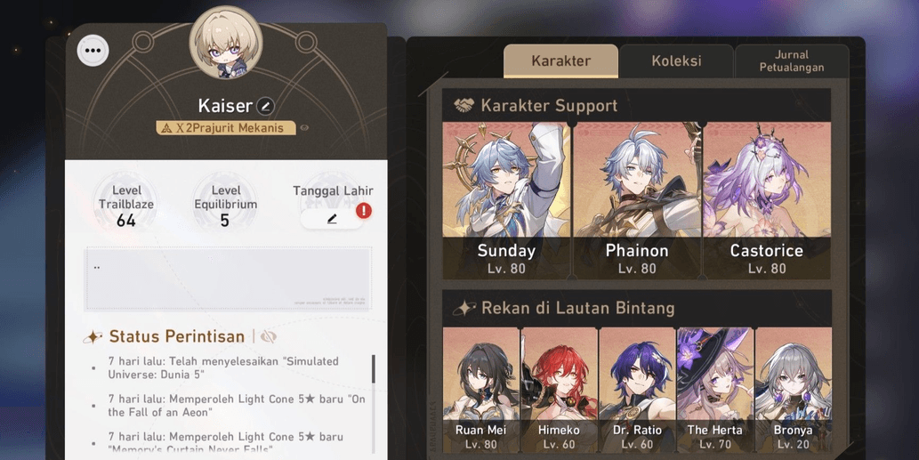 Akun Murah TL64 Phainon+LC Sign, Sunday+LC Sign, Castorice, Ruan Mei, The Herta, Dr.Ratio, Archer [Honkai: Star Rail]