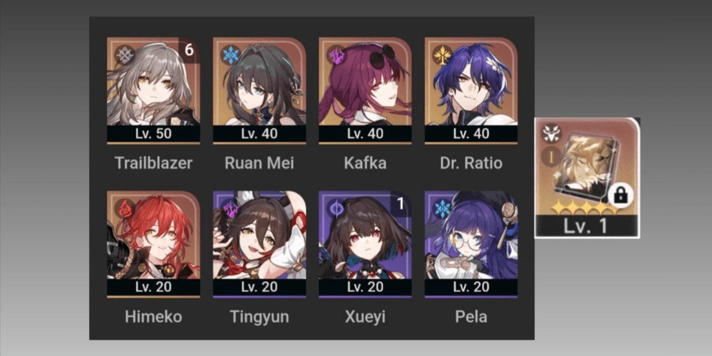 Saber[Sign], Archer[Sign], Phainon, Firefly, Kafka, Silver Wolf, Fuxuan, Luocha, Ruan Mei, Seele[E1], Dr.Ratio, Bronya[E1] MC Female