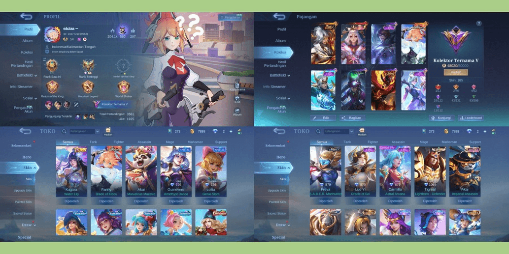 Cheap ML Account 82 Skins 70 Heroes Max Emblem 2. EpicSkin 13 Ling Kimmy Roger etc. Lightborn Granger Tigreal. Safe account ANTI HB