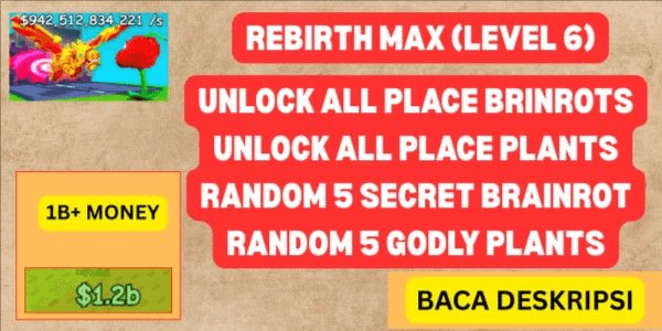 Account content: REBIRTH MAX (LEVEL 6) 5 RANDOM SECRET BRAINROTS 5 SECRET PLANTS + CHANCE TO OBTAIN HIGH-DAMAGE PLANTS ALL 17 BRAINROT SLOTS UNLOCKED (FULL) ALL 7 PLANT SLOTS UNLOCKED (FULL) FUSE MACHINE UNLOCKED AFTER LOGIN, ENSURE TO ADD AN EMAIL NOTE: AFTER PURCHASE, THE ACCOUNT WILL BE AUTOMATICALLY SENT TO YOUR ORDER HISTORY. BUY OTHER PRODUCTS EXCLUSIVELY AT: https://itemku.com/toko/murahnyo/14148366