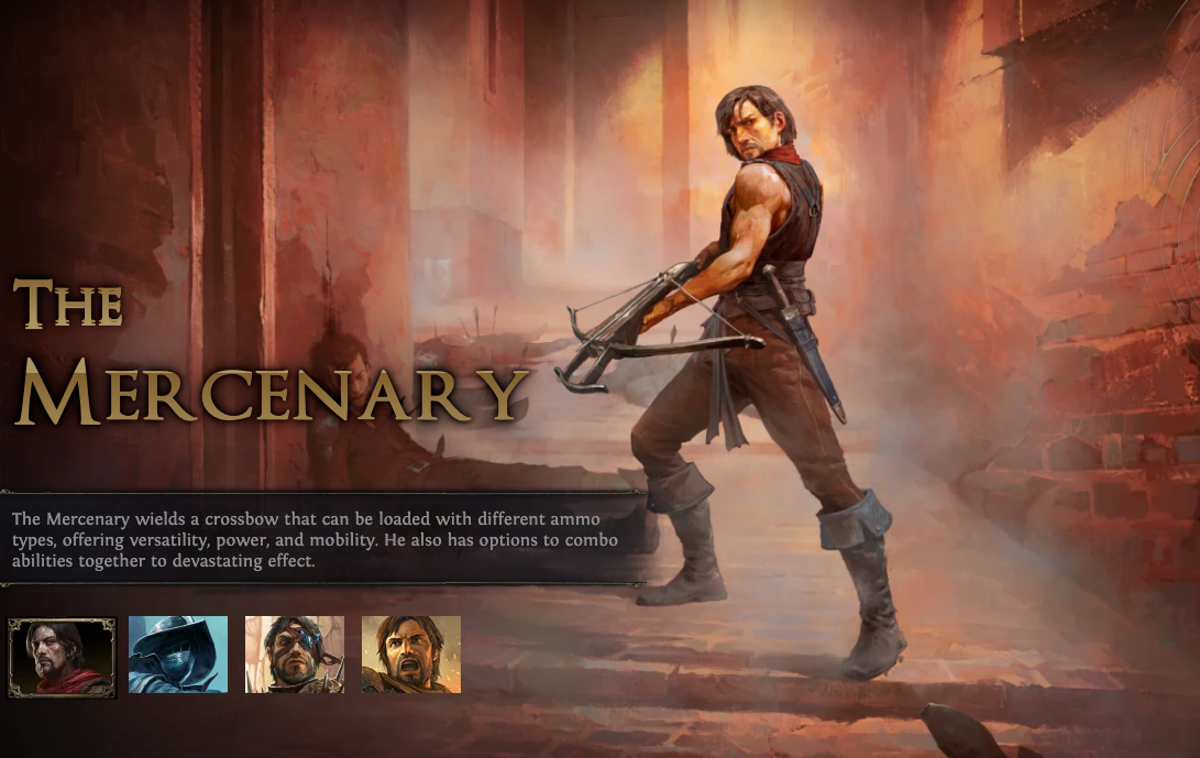 The mercenary plays differently from anyone else. A crossbow that he has can change between styles—rifle, shotgun, or sniper—depending on how you want it to be. Additions that he has, like grenades, nooses, and elemental modifications, make him a one-man army. He’s like a modern soldier in an old world: tactical and explosive. If you want versatility, style, and big numbers on screen, the Mercenary will keep your adrenaline up every fight.