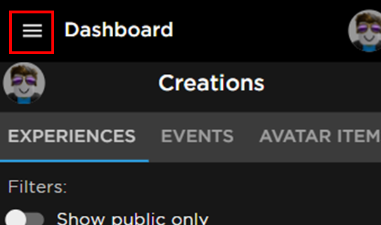 - Select Dashboard → open the menu again → choose Creations → Experiences.