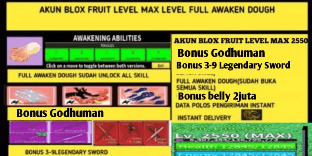 Blox Fruit Account Level Max Bonus Race Awakening V4 Full Gear (Awakening) (Full Awaken Dough + Godhuman + CDK + Soul Guitar)