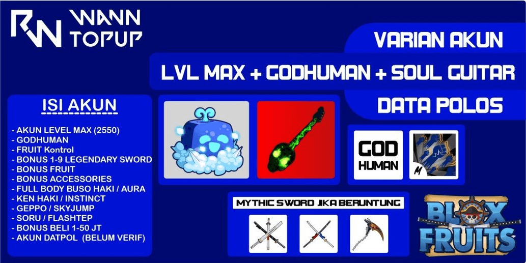 Akun Blox Fruit LEVEL MAX [GODHUMAN + INVENTORY Kontrol + SOUL GUITAR] [Data Polos] [Belum Verifikasi]