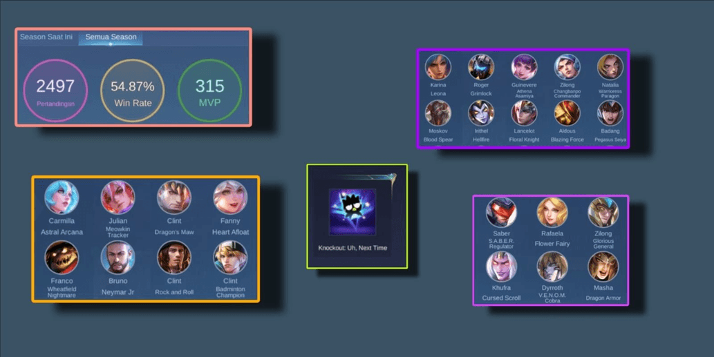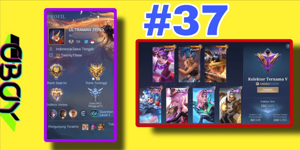 REGION INDONESIA NICKNAME: ULTRAMAN ZERO TOTAL HEROES: 102 TOTAL SKINS: 192 LEVEL: 58 EXP: 17536 CURRENT RANK: LEGEND LOGIN: EX ROCKER MOONTON (ALL EMPTY) ALMOST MAXED EVERYTHING ●●●●●●●●●●●● SKINS ●●●●●●●●●●●● COLLAB SKINS GUINEVERE Karina ROGER Badang BRUNO EPIC zilong rafaela moskov Irithel change carmila lancelot khufra SUMMER Faramis Hayabusa SPECIAL Balmond tigreal clint sun johnson estes harley grock odete jawhead change aldous belerick badang terizla lylia silvana aulus ELITE Alice karina bruno zilong fanny minotaur natalia chou ruby yas johnson cyclops lapu lapu karrie grock argus lance gusion change lunox vale hanzo harith khufra silvana cecilion carmila Atlas popol and kupa louyi khaleed barats beatrix aamon valentina floryn SEASON alice nana Alucard tigreal franco akai clint rafaela eudora gord alpha yisunshin moskov cyclops lapu lapu grock argus jawhead uranus minsitthar faramis terizla masha khaleed barats aulus valentina STARLIGHT Saber clint zilong layla moskov gusion martis aldous paquito valentina MYSTIC MEOW JULIAN LESLEY AS POPOL AND KUPA Rafaela MSC jawhead claude MYTH CLINT VENOM Dyroth LUCKY BOX Zilong COLLECTOR Natalia VALENTINE Claude DRAGON TAMER masha BLAZING aldous CHRISTMAS gord HALLOWEEN franco VALENTINE fanny MPL BRODY MCGOGO X-BORG