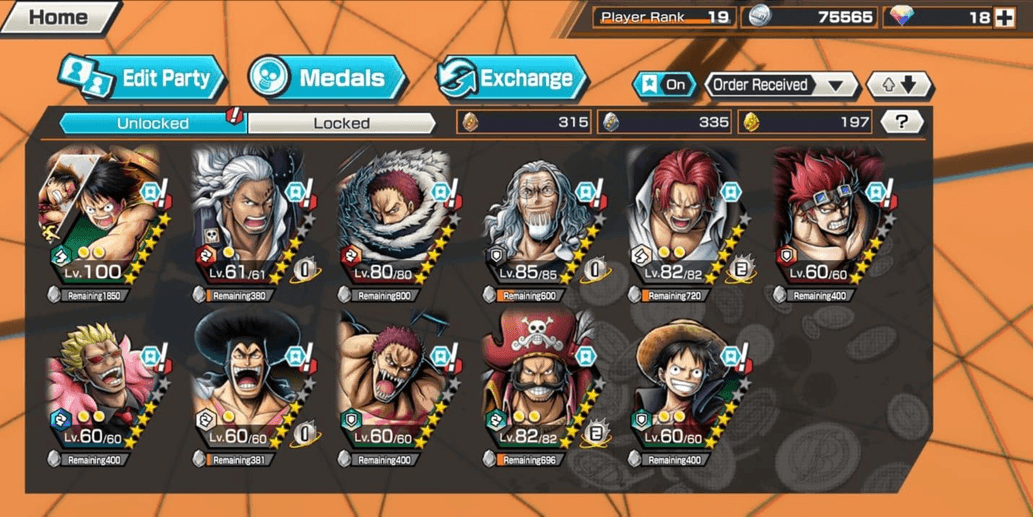 Extreme Character Roger LV 82 BOOST 2 + Extreme Shanks Kamusari LV 82 BOOST 2 + 6 Medal B9 + Character Lainnya OPBR