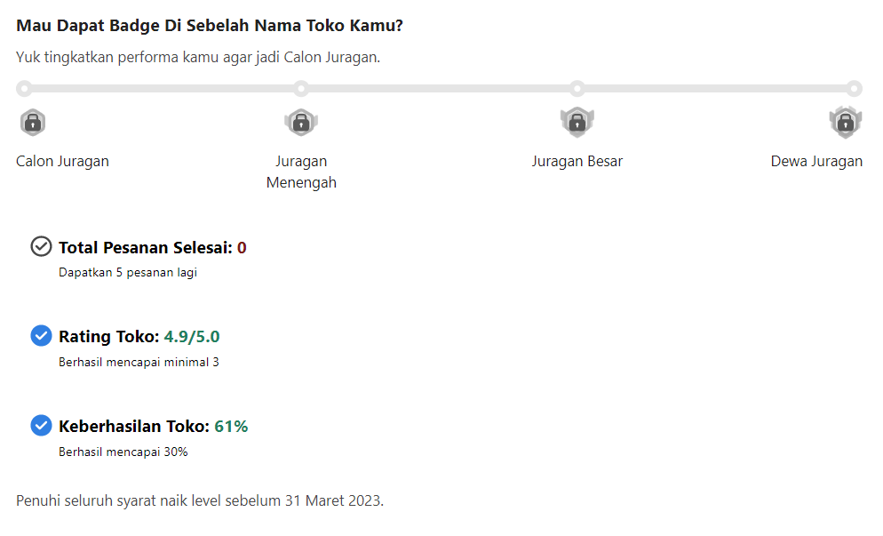 - Badge Juragan Menengah: telah mencapai minimal 1600 pesanan, rating 4, dan transaksi sukses 95.