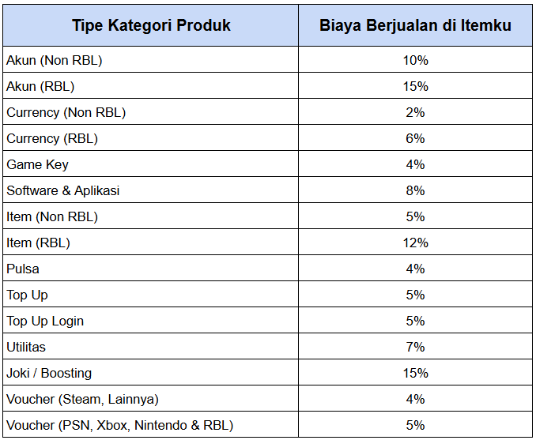 Skema pemotongan biaya berjualan di itemku:
